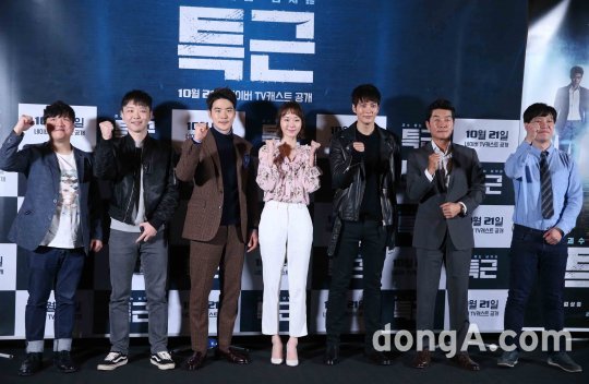 19일 오후 서울 용산구 한 멀티플렉스에서 열린 영화 '특근' 언론시사회에서 출연진이 포토타임을 하고 있다.