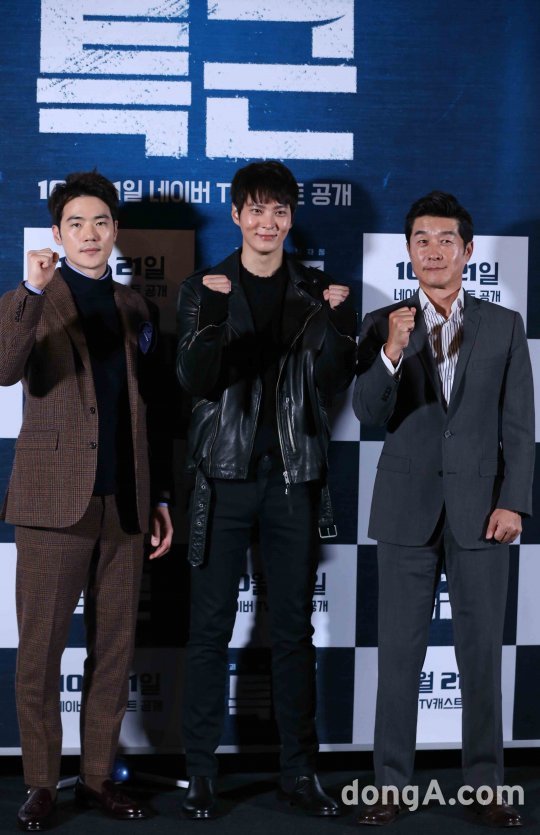 배우 김강우, 주원, 김상중(왼쪽부터)이 19일 오후 서울 용산구 한 멀티플렉스에서 열린 영화 '특근' 언론시사회에서 포토타임을 하고 있다.