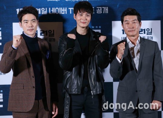 배우 김강우, 주원, 김상중(왼쪽부터)이 19일 오후 서울 용산구 한 멀티플렉스에서 열린 영화 '특근' 언론시사회에서 포토타임을 하고 있다.