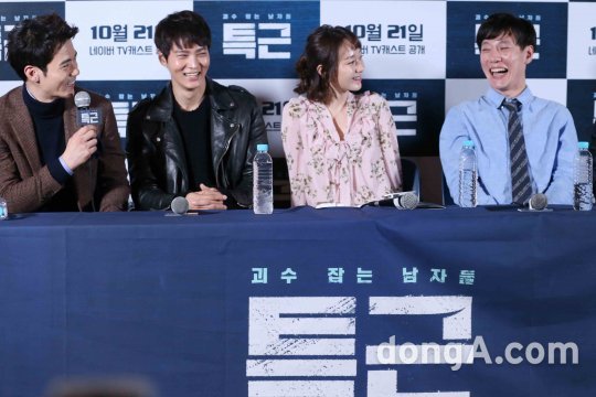 배우 김강우, 주원, 이유영, 감독 김건(왼쪽부터)이 19일 오후 서울 용산구 한 멀티플렉스에서 열린 영화 '특근' 언론시사회에 참석하고 있다.