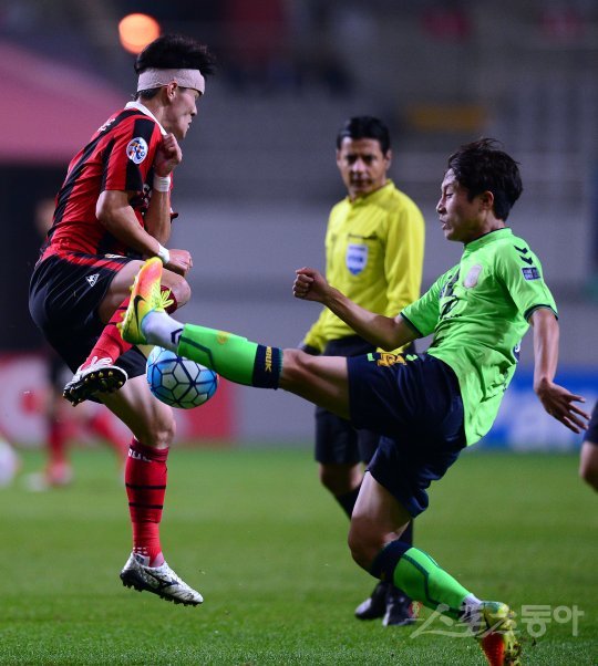 19일 서울월드컵경기장에서 2016 아시아축구연맹(AFC) 챔피언스리그(ACL) 4강 2차전 FC서울과 전북현대 경기에서 전북 장윤호와 서울 주세종이 볼다툼을 하고 있다.