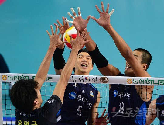 19일 서울 장충체육관에서 ‘2016-2017 NH농협 V리그 남자부’ 우리카드와 OK 저축은행의 경기가 열렸다. 2세트 우리카드 김광국과 김은섭, OK 저축은행 송명근이 치열한 볼 다툼을 벌이고 있다.