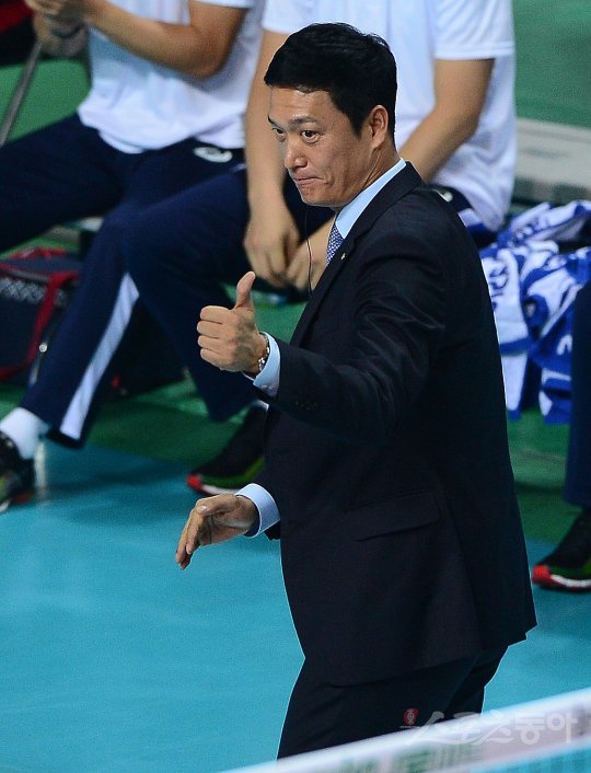 19일 서울 장충체육관에서 ‘2016-2017 NH농협 V리그 남자부’ 우리카드와 OK 저축은행의 경기가 열렸다. 2세트 우리카드 김상우 감독이 득점에 성공한 후 선수들을 향해 엄지손가락을 내밀고 있다.