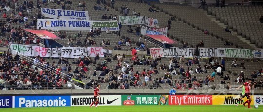 19일 서울월드컵경기장에서 2016 아시아축구연맹(AFC) 챔피언스리그(ACL) 4강 2차전 FC서울과 전북현대 경기에서 서울 응원단이 전북의 심판매수를 비난하는 현수막을 들고 응원을 하고 있다.