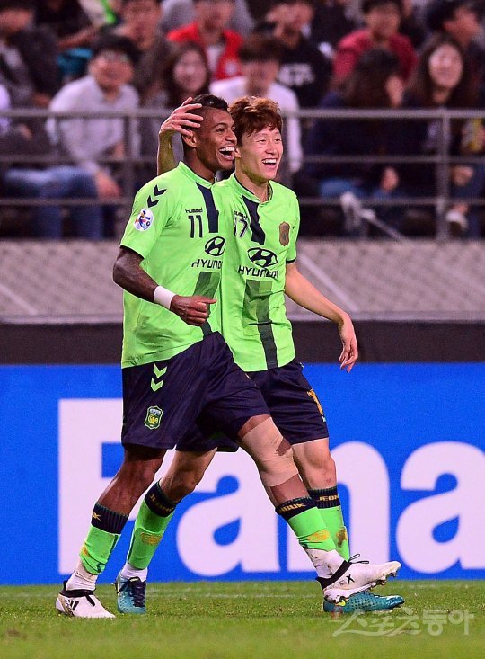 19일 서울월드컵경기장에서 2016 아시아축구연맹(AFC) 챔피언스리그(ACL) 4강 2차전 FC서울과 전북현대 경기에서 후반전 전북 로페즈가 동점골을 성공시키고 이재성과 기뻐하고 있다.