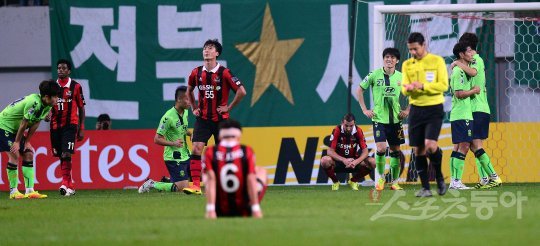 19일 서울월드컵경기장에서 2016 아시아축구연맹(AFC) 챔피언스리그(ACL) 4강 2차전 FC서울과 전북현대 경기에서 1-2로 패했으나 결승 진출을 확정지은 전북 선수들이 하이파이브 하고 있다.