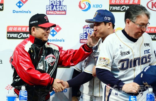 20일 창원 마산종합운동장 내 올림픽기념관에서 ‘2016 타이어뱅크 KBO리그’ NC 다이노스와 LG 트윈스의 플레이오프 미디어데이가 열렸다. LG 양상문 감독이 NC 김태군과 악수를 나누고 있다.