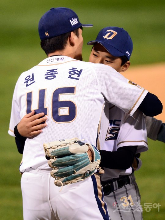 육종암 판정을 받은 위주빈군과 암을 극복한 NC 원종현이 시구와 시포를 맡은 뒤 서로 얼싸안고 있다.