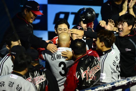 7회초 무사에서 LG 히메네스가 NC 선발 해커를 상대로 좌월 솔로 홈런을 쏘아올린 뒤 동료들의 환영을 받고 있다.