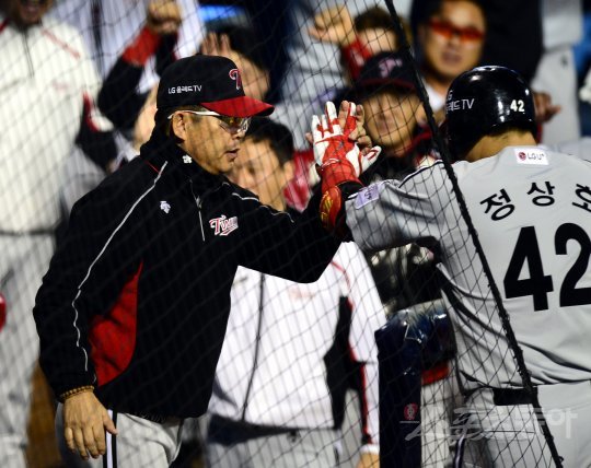 8회초 무사에서 LG 정상호가 NC 선발 해커를 상대로 좌월 솔로 홈런을 쏘아올린 뒤 양상문 감독의 환영을 받고 있다.