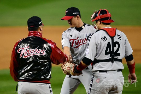 9회말 무사 1, 3루에서 NC 지석훈에게 적시타를 허용한 LG 마무리 임정우가 교체되고 있다.