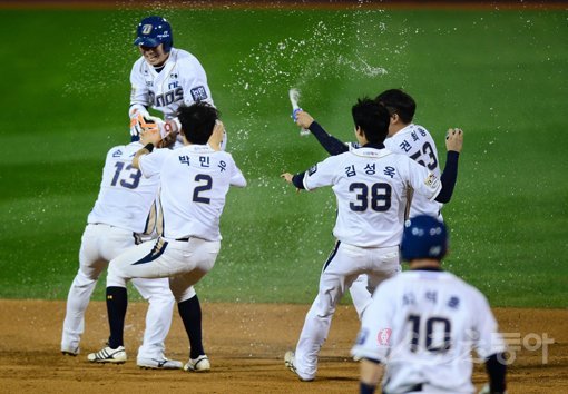 21일 창원 마산야구장에서 ‘2016 타이어뱅크 KBO리그’ NC 다이노스와 LG 트윈스의 플레이오프 1차전 경기가 열렸다.9회말 1사 만루에서 NC 용덕한이 끝내기 안타를 치고난 뒤 동료들의 환영을 받고 있다.마산|김민성 기자 marineboy@donga.com