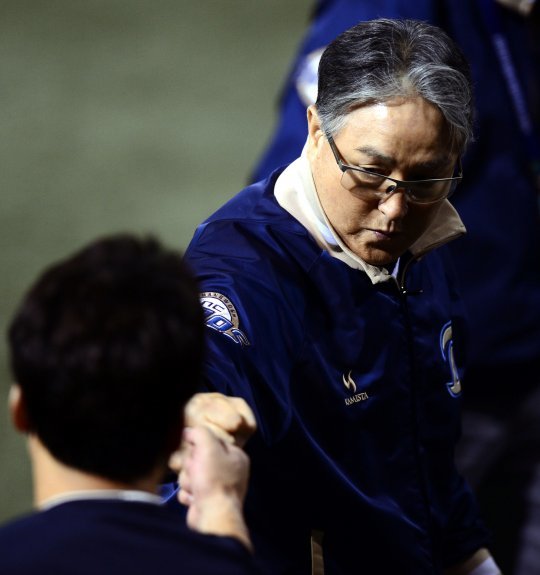 9회말 1사 만루에서 NC가 용덕한의 끝내기 안타로 LG에 3-2로 승리한 뒤 김경문 감독이 용덕한과 하이파이브를 나누고 있다.