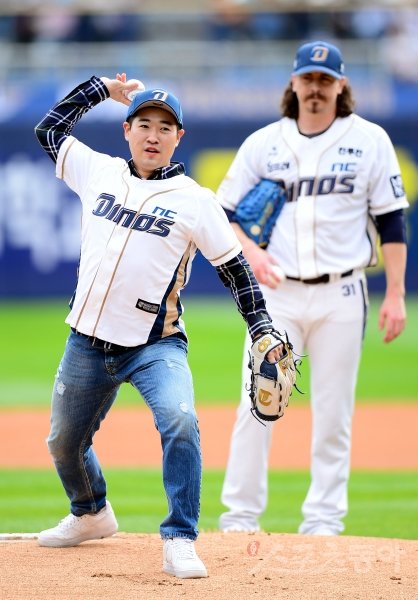 22일 창원 마산야구장에서 '2016 타이어뱅크 KBO리그' NC 다이노스와 LG 트윈스의 플레이오프 2차전 경기가 열렸다. 리우올림픽 사격 은메달리스트 김종현 시구를 던지고 있다. 마산 | 김민성 기자 marineboy@donga.com
