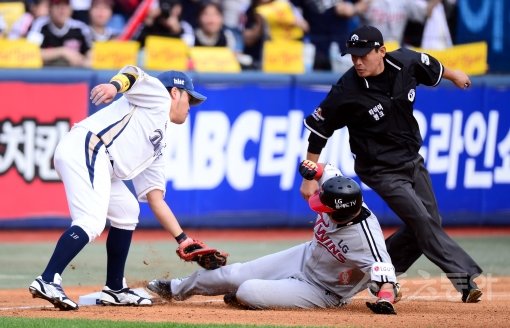 22일 창원 마산야구장에서 ‘2016 타이어뱅크 KBO리그’ NC 다이노스와 LG 트윈스의 플레이오프 2차전 경기가 열렸다. 5회초 1사에서 LG 채은성이 2루타를 치고난 뒤 상대실책으로 3루까지 달려 세이프되고 있다. 마산 | 김민성 기자 marineboy@donga.com