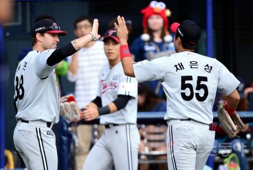 22일 창원 마산야구장에서 ‘2016 타이어뱅크 KBO리그’ NC 다이노스와 LG 트윈스의 플레이오프 2차전 경기가 열렸다. 4회말 2사에서 NC 이호준의 홈런성 타구를 LG 채은성이 잡은 뒤 허프의 환영을 받고 있다. 마산 | 김민성 기자 marineboy@donga.com