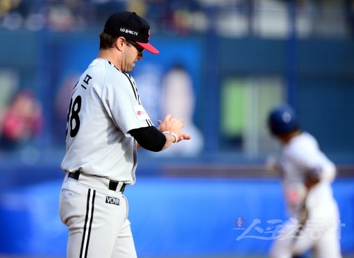 22일 창원 마산야구장에서 ‘2016 타이어뱅크 KBO리그’ NC 다이노스와 LG 트윈스의 플레이오프 2차전 경기가 열렸다. 7회말 2사 1루에서 NC 박석민에게 투런홈런을 허용한 LG 선발 허프가 아쉬워하고 있다. 마산 | 김민성 기자 marineboy@donga.com