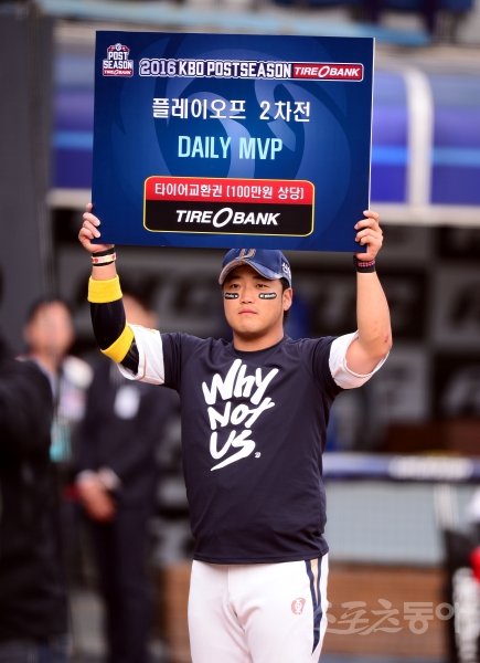 22일 창원 마산야구장에서 '2016 타이어뱅크 KBO리그' NC 다이노스와 LG 트윈스의 플레이오프 2차전 경기가 열렸다. 데일리 MVP를 수상한 NC 박석민이 기념촬영을 하고 있다. 마산 | 김민성 기자 marineboy@donga.com