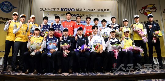24일 서울 청담동 리베라호텔에서 ‘2016-2017 NH농협 V리그’ 남자 신인선수 드래프트가 열렸다. 프로배구에 지명된 선수들이 기념촬영을 하고 있다.