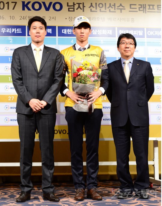 24일 서울 청담동 리베라호텔에서 ‘2016-2017 NH농협 V리그’ 남자 신인선수 드래프트가 열렸다. KB손해보험 강성형 감독이 전체 1순위로 성균관대 황택의를 지명해 기념촬영을 하고 있다.