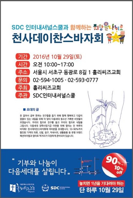 SDC 인터내셔널 스쿨이 10월29일 서울 서초구 방배동 홀리씨즈 교회에서 ‘천사데이 찬스 바자회’를 개최한다. 장학재단 설립기금을 마련하기 위한 자리로 오전 10시부터 오후 5시까지 문을 연다.