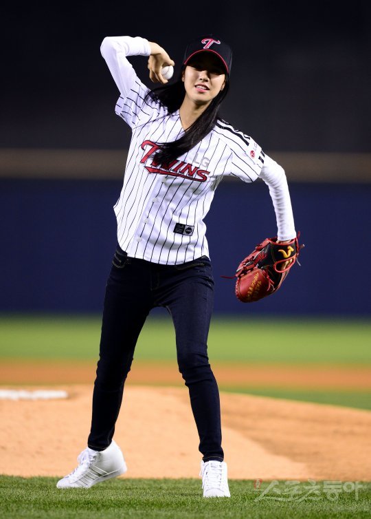 24일 서울 잠실야구장에서 ‘2016 타이어뱅크 KBO리그’ NC 다이노스와 LG 트윈스의 플레이오프 3차전 경기가 열렸다. 배우 진세연이 시구를 던지고 있다.