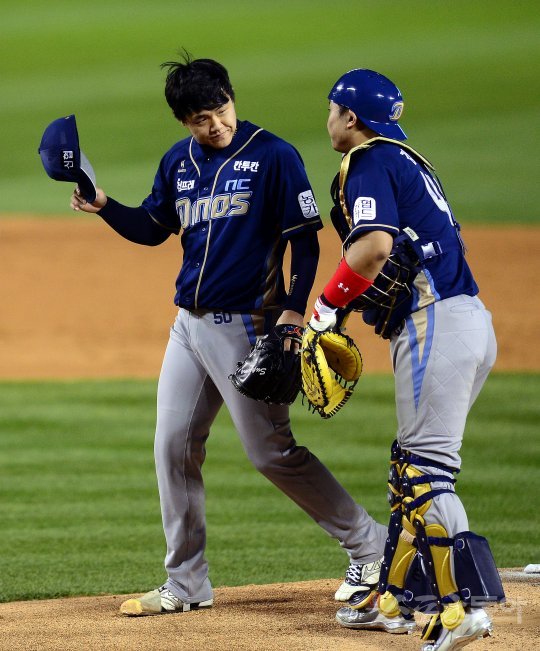 24일 서울 잠실야구장에서 ‘2016 타이어뱅크 KBO 리그’ 플레이오프 3차전 NC다이노스와 LG트윈스 경기가 열렸다. 선발 투수로 등판한 NC 장현식이 2회말 무사 1루 상황에서 강판되고 있다.