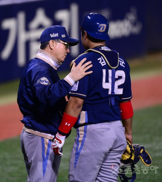 24일 서울 잠실야구장에서 ‘2016 타이어뱅크 KBO 리그’ 플레이오프 3차전 NC다이노스와 LG트윈스 경기가 열렸다. 2회말 2사 만루 상황에서 NC 김경문 감독이 포수 김태군을 불러 무언가를 이야기 하고 있다.
