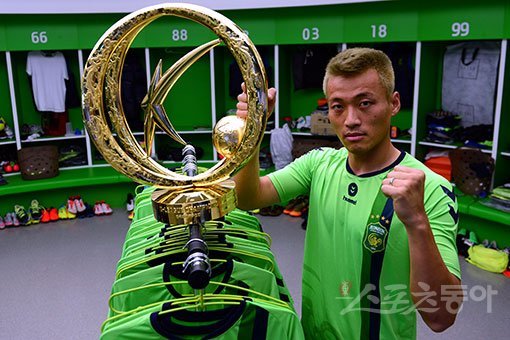“알 자지라(아랍에미리트연합)에서 뛰다 2014년 여름 전북에 왔다. 이 때 유일하게 맛보지 못한 우승이 K리그였다. 포항 스틸러스에서 2008년부터 2012년까지 뛰면서 FA컵(2008)과 아시아축구연맹(AFC) 챔피언스리그(2009)에서 모두 정상에 섰다. 그러다 전북에서 2014년 2% 부족함을 채웠다. 솔직히 여운을 느낄 수 없었다. 부랴부랴 군 입대를 했으니.”
