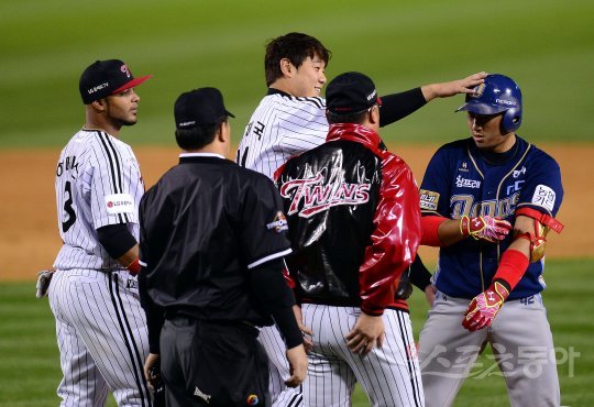 24일 서울 잠실야구장에서 ‘2016 타이어뱅크 KBO 리그’ 플레이오프 3차전 NC다이노스와 LG트윈스 경기가 열렸다. 선발 투수로 등판한 LG 류제국이 5회초 NC 김태군의 타구가 머리쪽으로 날아오자 황급히 피한 뒤 김태군의 사과에 괜찮다는듯 머리를 치고 있다.