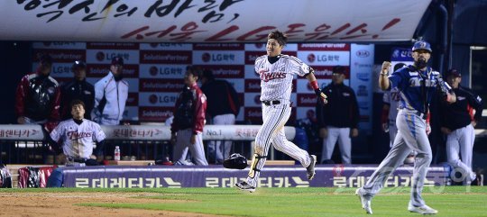 24일 잠실야구장에서 ‘2016 타이어뱅크 KBO리그 포스트시즌 플레이오프 3차전’ NC 다이노스와 LG 트윈스의 경기가 열렸다. 8회말 2사 만루에서 LG 채은성이 NC 나성범에게 잡히며 아웃으로 이닝이 종료되자 헬멧을 던지며 아쉬워하고 있다.