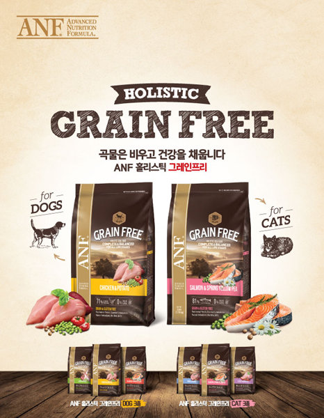 ANF 홀리스틱 그레인프리 제품 중 반려견을 위한 사료는 연어&병아리콩, 양고기&감자, 치킨&감자 3종이 출시됐으며, 반려묘를 위한 사료는 돼지고기&닭고기, 연어&병아리콩, 칠면조&닭고기 3종이 있다.