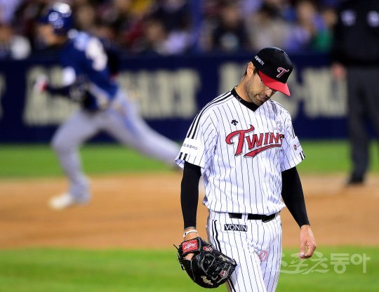 25일 잠실야구장에서 ‘2016 타이어뱅크 KBO리그 포스트시즌 플레이오프 4차전’ NC 다이노스와 LG 트윈스의 경기가 열렸다. 7회초 1사 1루에서 LG 허프가 NC 김성욱에게 투런홈런을 허용 후 고개를 떨구고 있다.