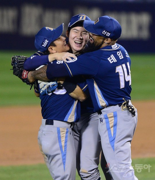 25일 잠실야구장에서 열린 ‘2016 타이어뱅크 KBO리그 포스트시즌 플레이오프 4차전’ NC 다이노스와 LG 트윈스의 경기에서 NC가 8-3 승리를 거두며 한국시리즈에 진출했다. 경기 후 NC 선수들이 기쁨을 나누고 있다.