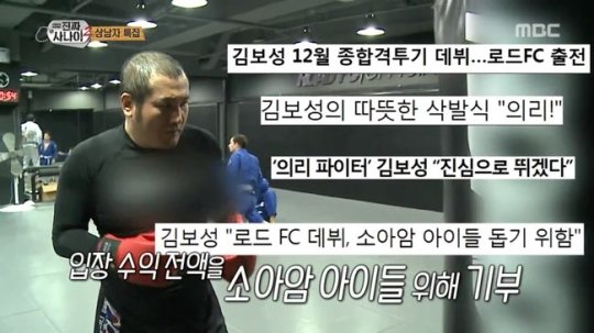 김보성과 윤형빈은 ROAD FC 파이터다. 김보성은 12월 10일 서울 장충체육관에서 ROAD FC 데뷔전을 치른다. 소아암 어린이 돕기가 목적이며 ROAD FC (로드FC)의 입장수익 전액과 김보성의 파이트머니가 전액 소아암 어린이들을 위해 기부된다.