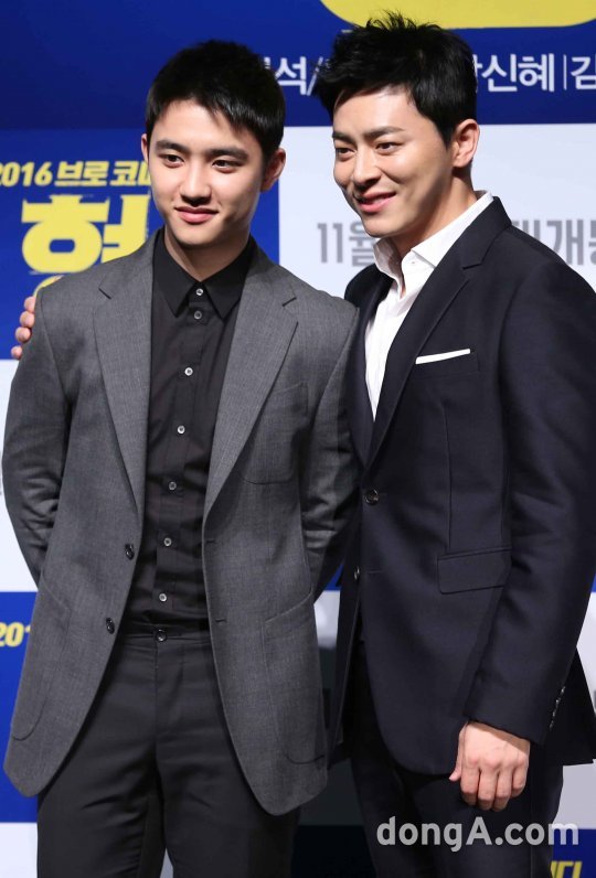 배우 도경수(왼쪽)와 조정석이 26일 오전 서울 강남 압구정 한 멀티플렉스에서 열린 영화 형 제작보고회에 참석해 포토타임을 하고 있다.