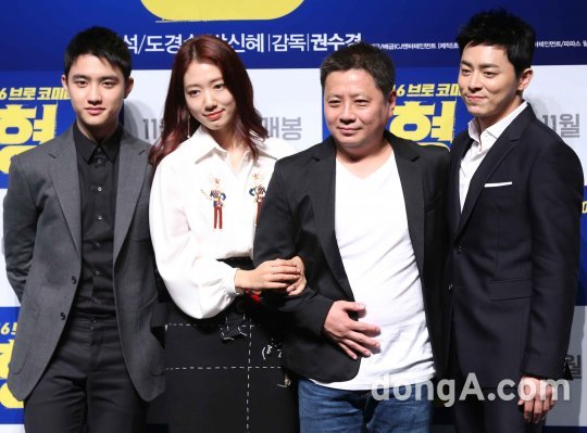 배우 도경수, 박신혜, 감독 권수경, 조정석(왼쪽부터)이 26일 오전 서울 강남 압구정 한 멀티플렉스에서 열린 영화 형 제작보고회에 참석해 포토타임을 하고 있다.