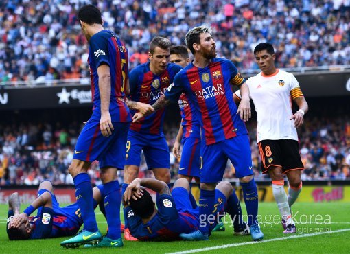 바르셀로나는 22일(이하 한국시각) 스페인 발렌시아 메스타야 캄프 데 메스타야에서 열린 2016-17 스페인 프리메라리가 9라운드에서 추가시간 메시의 페널티킥 골에 힘입어 발렌시아에 3-2로 역전승했다. 당시 메시는 2-2로 팽팽히 맞선 후반 추가시간 페널티킥을 성공시키며 팀에 승리를 안겼다. 직후 메시를 비롯, 네이마르와 수아레스 등 바르셀로나 선수들은 격하게 골 세레모니를 즐기고 있었다.