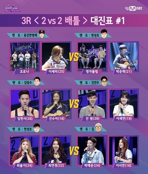 오는 27일(목) 밤 9시 40분 방송되는 Mnet ‘슈퍼스타K 2016’ 6회에서는 지난주에 이어 3라운드 ‘2 VS 2 배틀’을 펼치는 참가자들의 불꽃 튀는 경쟁이 그려진다. ‘슈퍼스타K 2016’ 제작진은 방송에 앞서 참가자들의 대진표를 추가로 공개했다. 대진표를 살펴보면, 임현서-진수아 VS 진원-이세연, 최솔지-최연정 VS 박태준-이서연, 코로나-이세라 VS 영자돌림-박준혁 등 화제의 참가자들이 배틀을 예고해 눈길을 끈다. 특히, 지난 방송에서 김영근-이지은의 ‘사랑 그렇게 보내네’가 뜨거운 화제를 모은 만큼, 이들을 잇는 또 하나의 레전드 무대가 탄생할지 기대를 모은다.