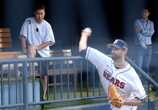 26일 잠실야구장에서 한국시리즈를 앞두고 두산 베어스가 훈련을 가졌다. 두산 유희관이 불펜 피칭을 하는 니퍼트를 지켜보고 있다.