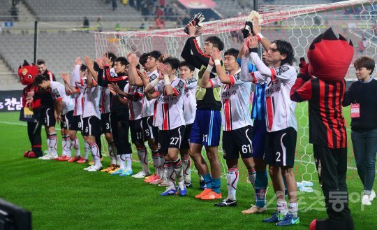 26일 서울월드컵경기장에서 열린 ‘2016 KEB 하나은행 FA컵’ 준결승 FC 서울과 부천FC 1955의 경기에서 FC 서울이 1-0 승리를 거두며 결승에 진출했다. 경기 후 FC 선수들이 서포터들을 향해 인사를 하고 있다.