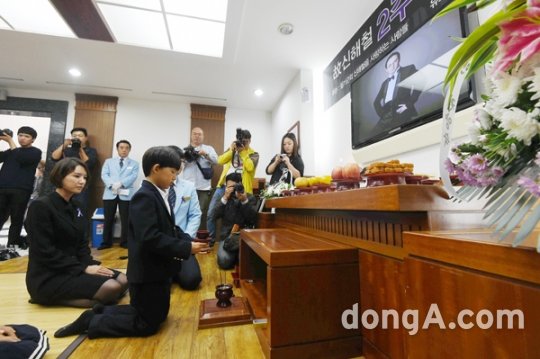 가수 故신해철의 아내 윤원희씨와 자녀들이 27일 오후 경기도 안성 유토피아 추모관에서 열린 故신해철 2주기 추모식에 참석해 기제사를 지내고 있다.