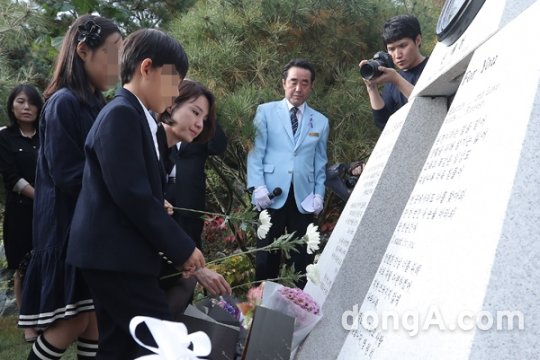 가수 故신해철의 아내 윤원희씨와 자녀들이 27일 오후 경기도 안성 유토피아 추모관에서 열린 故신해철 2주기 추모식에 참석해 추모식을 하고 있다.