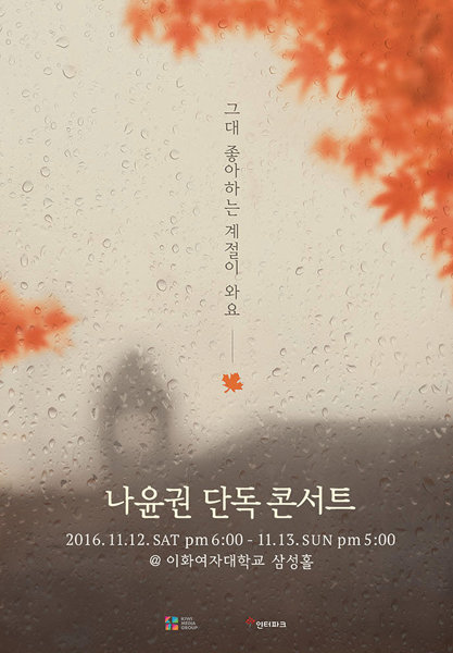 꾸준히 마니아층을 넓혀가는 ‘감성 발라더’ 나윤권이 ‘계절’을 테마로 벌이는 콘서트. 배우 한예리와 함께 부른 신곡 ‘러브 테라피’ 이후 갖는 첫 콘서트다. 깊어가는 가을 분위기에 어울리는 특유의 쓸쓸하면서도 서정적인 레퍼토리를 선사할 예정이다. 나윤권 콘서트의 또 하나의 재미는 이벤트. 나윤권과 나눈 소소한 추억이나, 사랑과 이별 등에 얽힌 계절 속 이야기를 미리 e메일(2016na_concert@naver.com)로 보내면 나윤권이 이를 바탕으로 이벤트로 선보인다. 문의 1544-1555.