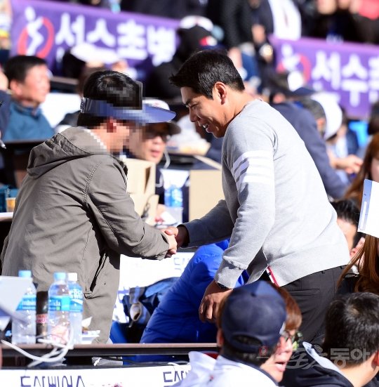 30일 서울 잠실야구장에서 ‘2016 타이어뱅크 KBO 리그’ 한국시리즈 2차전 NC다이노스와 두산베어스 경기가 열렸다. 피츠버그 강정호가 야구장을 찾아 누군가와 인사를 나구고 있다. 잠실 | 김종원기자 won@donga.com
