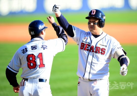 4회말 1사 만루에서 두산 양의지가 1타점 적시타를 치고난 뒤 강동우 코치와 기쁨을 나누고 있다. 잠실 | 김민성 기자