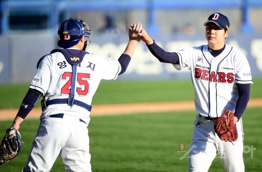 7회초 1사 1루에서 NC 박석민을 병살아웃시킨 두산 선발 장원준이 이닝종료 후 양의지와 기쁨을 나누고 있다. 잠실 | 김민성