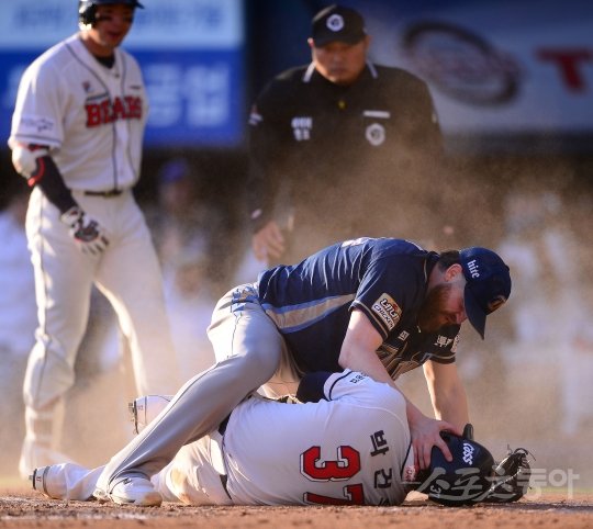 8회말 2사 3루에서 NC 선발 해커가 와일드 피치 상황에서 홈으로 쇄도 중 충돌한 두산 박건우의 상태를 살피고 있다. 잠실 |