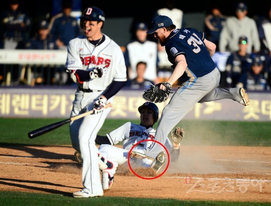 30일 서울 잠실야구장에서 ‘2016 타이어뱅크 KBO리그’ 두산 베어스와 NC 다이노스의 한국시리즈 2차전 경기가 열렸다. 8회말 2사 3루에서 두산 김재환 타석 때 폭투로 3루주자 박건우가 홈으로 파고들다 NC 선발 해커에게 무릎을 밟히며 부상을 당하고 있다.