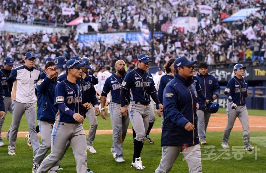 30일 잠실야구장에서 열린 ‘2016 타이어뱅크 KBO리그 포스트시즌 한국시리즈 2차전’ NC 다이노스와 두산 베어스의 경기에서 두산이 5-1로 승리했다. 경기 후 NC 선수들이 아쉬운 표정으로 그라운드를 빠져나가고 있다.
